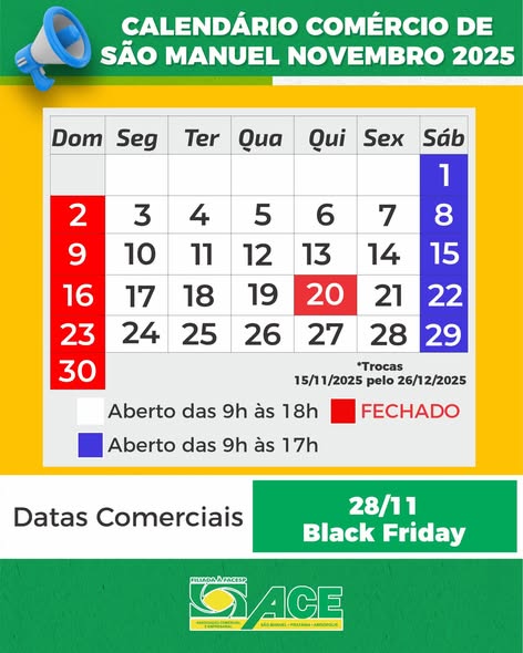 A ACESM lembra que este é o momento ideal para planejar ações, promoções e campanhas especiais. Novembro traz datas que movimentam o varejo, como a Black Friday e o início do aquecimento para o Natal.